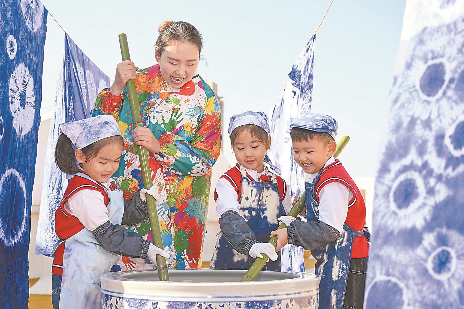 11月11日,在合肥市大西门幼儿园教育集团固镇路分园,小朋友们在学习体验非遗扎染技艺。通讯员 赵明 摄