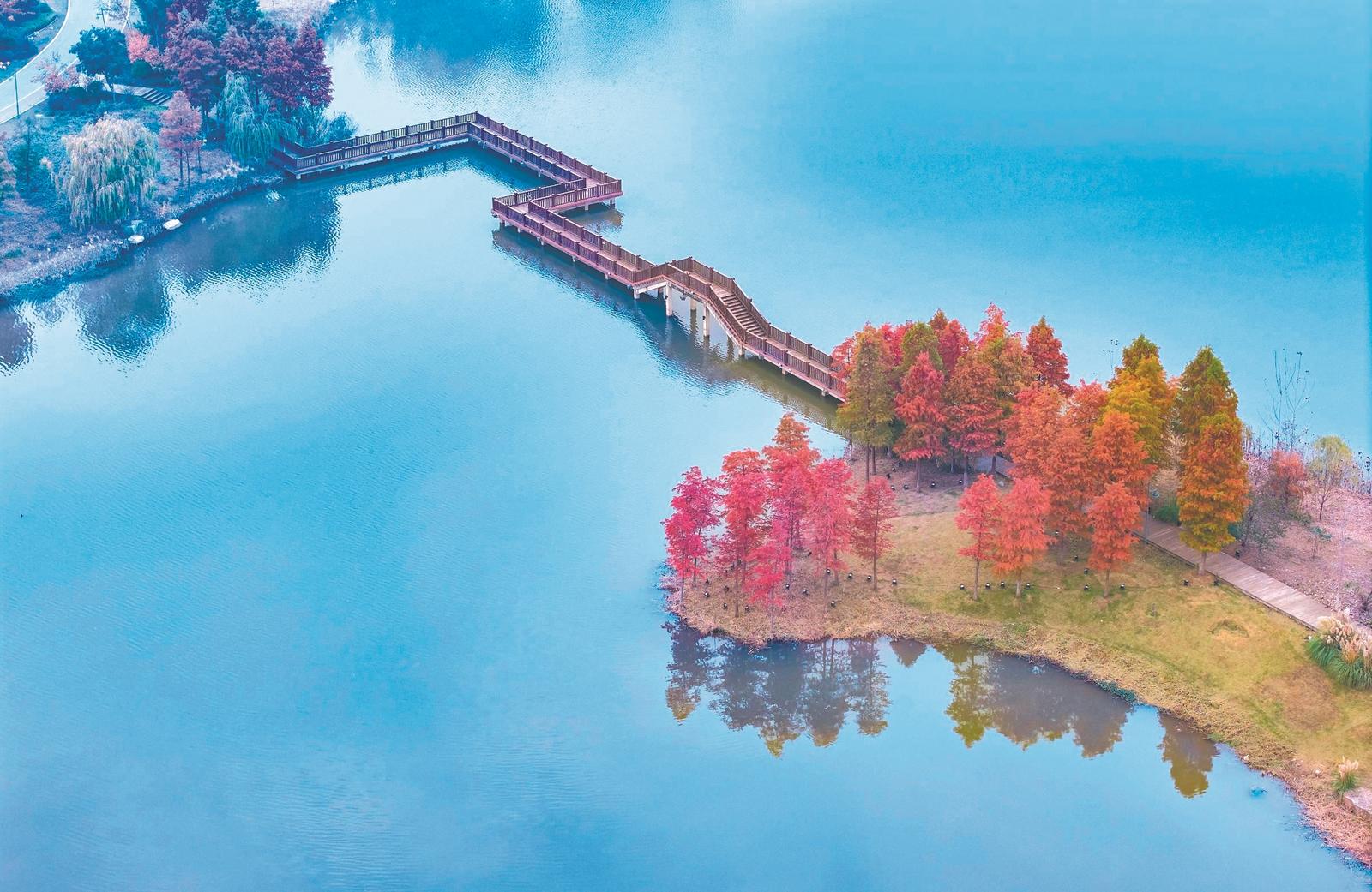 11月13日,初冬时节的朔西湖景区,层林尽染,湖水潋滟,绘就一幅绚丽迷人生态画卷。朔西湖位于淮北市杜集区朔里镇,前身是煤矿采煤沉陷形成的塌陷区,当地积极开展生态修复,打造集生态湿地与文旅功能于一体的综合体,成为一处受群众青睐的“网红打卡地”。记者 李博 摄
