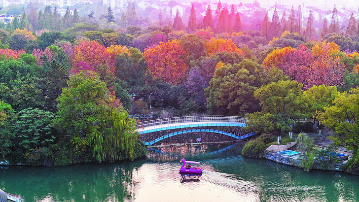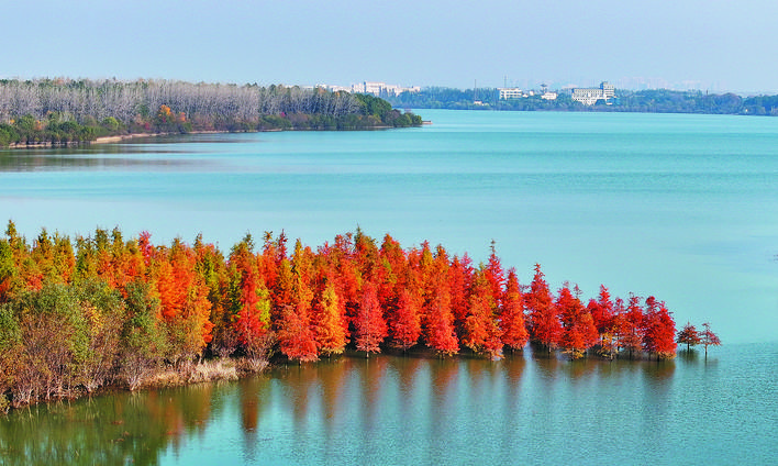二十四节气的小雪刚过,合肥的初冬便携着彩墨而来。逍遥津的古银杏最是慷慨,把金黄铺得满地都是;董铺水库的池杉林正燃成“火海”,铺红半片水岸;天鹅湖畔的林间更是打翻了调色盘,交织成锦……