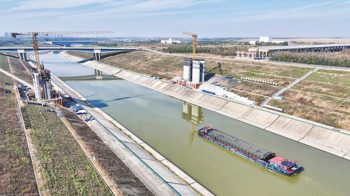 11月22日,蜀山区小庙镇,淮桐高速合肥段引江济淮特大桥建设现场一片忙碌景象,施工人员加紧推进工程建设。引江济淮特大桥是淮桐高速合肥段关键控制性工程,全长1078米,跨越引江济淮航道南北大坝。通讯员 陈三虎 摄