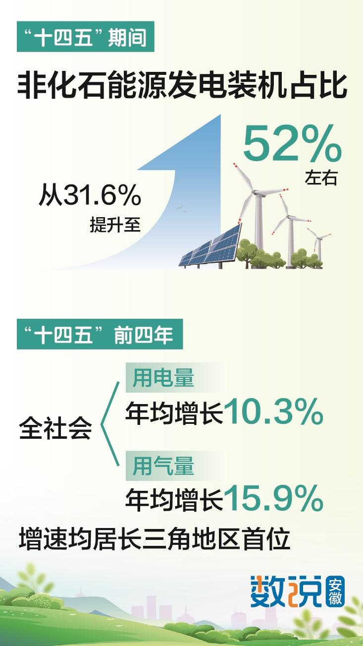 数据显示,全省煤炭产能稳定在1.3亿吨/年,产量稳定在1亿吨至1.1亿吨,居全国第6位。非化石能源发电装机占比从31.6%提升至52%左右、“十四五”期间累计提升超过21个百分点,非化石能源消费占比从9.6%提升至17%左右、累计提升约7.4个百分点,超额完成“十四五”规划目标。全社会用电量、用气量“十四五”前四年年均分别增长10.3%、15.9%,增速均居长三角地区首位。