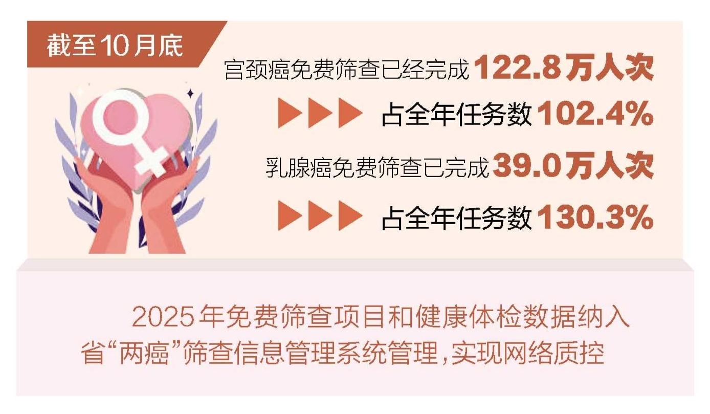 “加强适龄女性‘两癌’防治”纳入我省2025年民生实事项目,今年计划为农村地区适龄妇女提供120万人次宫颈癌、30万人次乳腺癌免费筛查服务。据省卫生健康委相关工作人员介绍,截至10月底,宫颈癌免费筛查已经完成122.8万人次,占全年任务数102.4%,乳腺癌免费筛查已完成39.0万人次,占全年任务数130.3%。2025年将免费筛查项目和健康体检数据纳入省“两癌”筛查信息管理系统管理,实现网络质控。