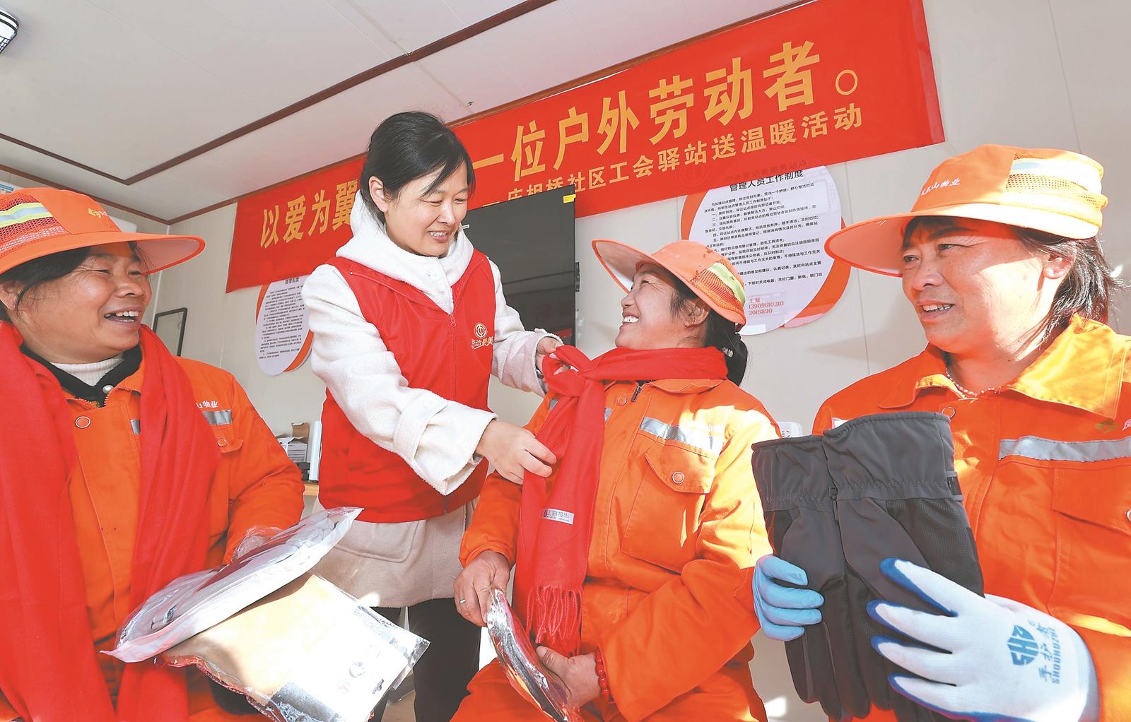 近日,在淮北市相山区庆相桥社区工会驿站,相山区总工会工作人员向环卫工送上护膝、手套、围巾等冬季防护用品,确保户外劳动者平安温暖过冬。通讯员 张锋 刘晴 摄