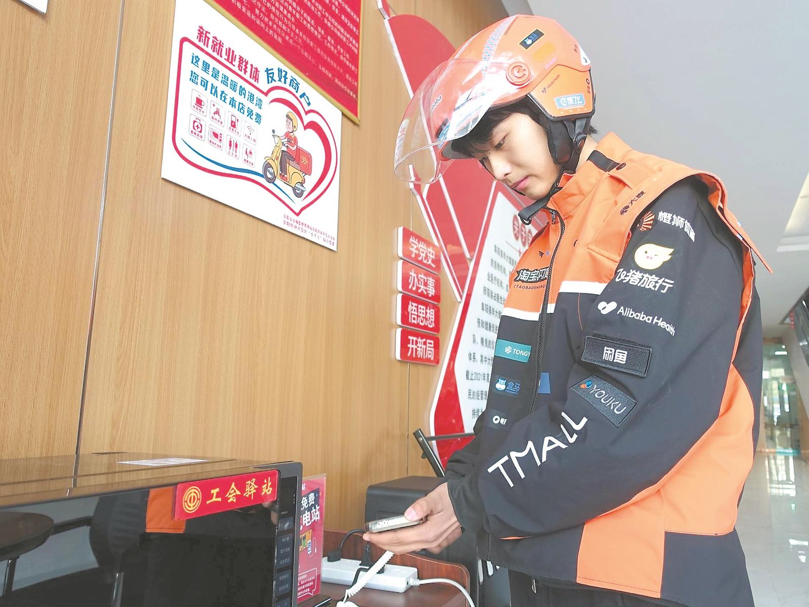 11月27日,在阜阳一工会驿站内,一名外卖员在给自己的手机充电。冬季来临,阜阳市的工会驿站、爱心驿站陆续开启“温暖”模式,用实际行动关爱户外劳动者。特约摄影 王彪 摄