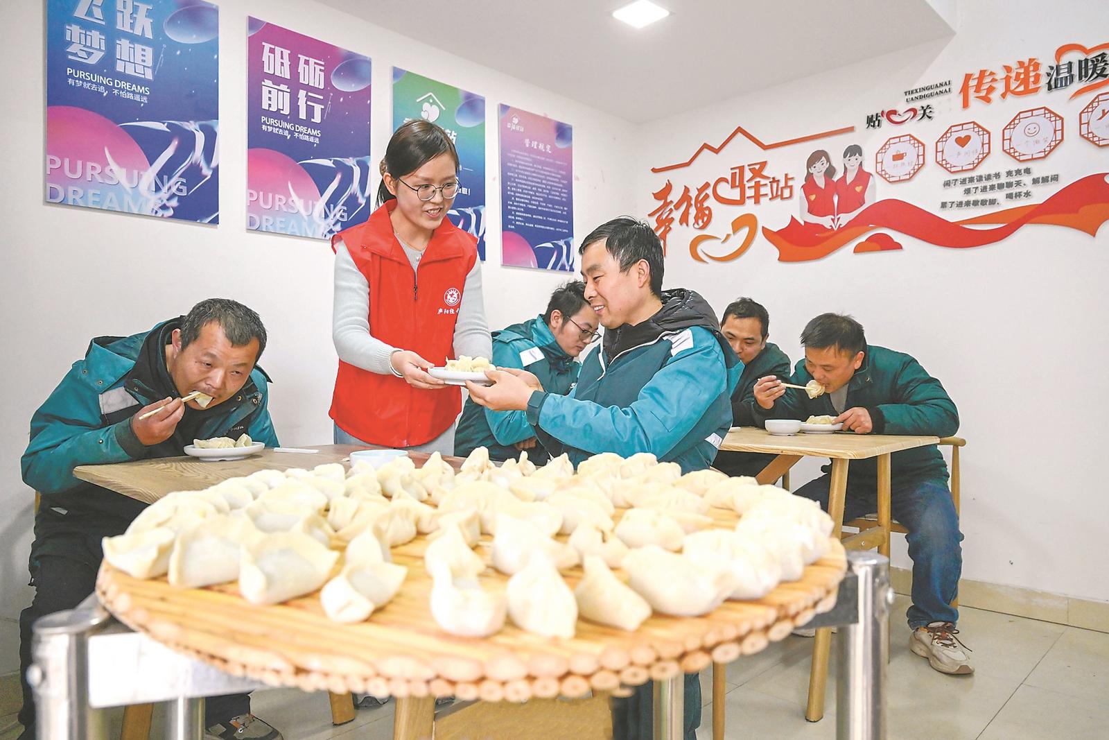 11月27日,在合肥市庐阳区林店街道工会驿站,快递小哥正在品尝水饺。冬季到来,当地工会为辖区新就业群体提供手套、保温杯等礼包,“温暖”新就业群体。通讯员 赵明 摄