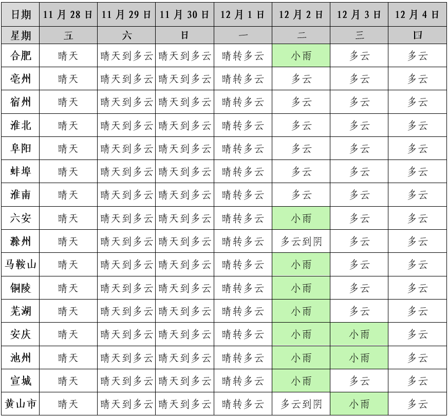 2日:淮北地区多云;淮河以南多云到阴天,部分地区有小雨,其中大别山区局部夜里有雨夹雪或小雪。