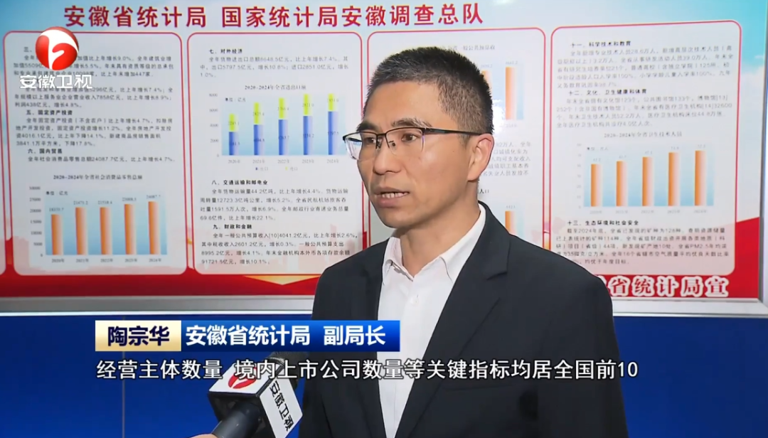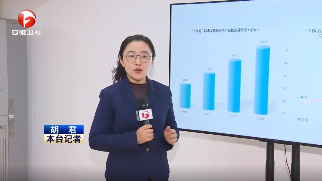 我现在是在安徽省统计局的数据监测中心。大家看我身后大屏上的这一组数据,安徽省地区生产总值稳步提升,并实现历史性跨越,在2024年达到了5.06万亿元。而能体现经济发展质量的,是旁边的这组数据。全省战略性新兴产业产值占规上工业的比重已经达到了43.6%,这不仅体现出战略性新兴产业为GDP的增长提供了重要动力,更体现出全省经济结构在不断优化。