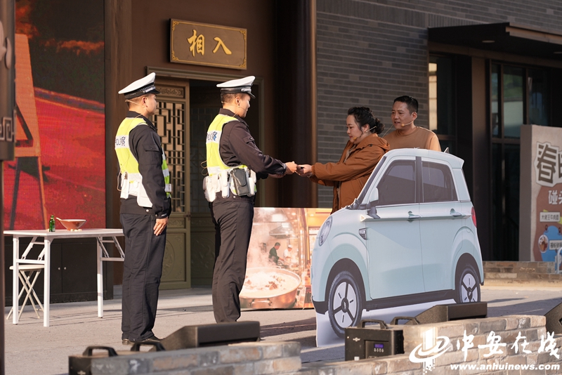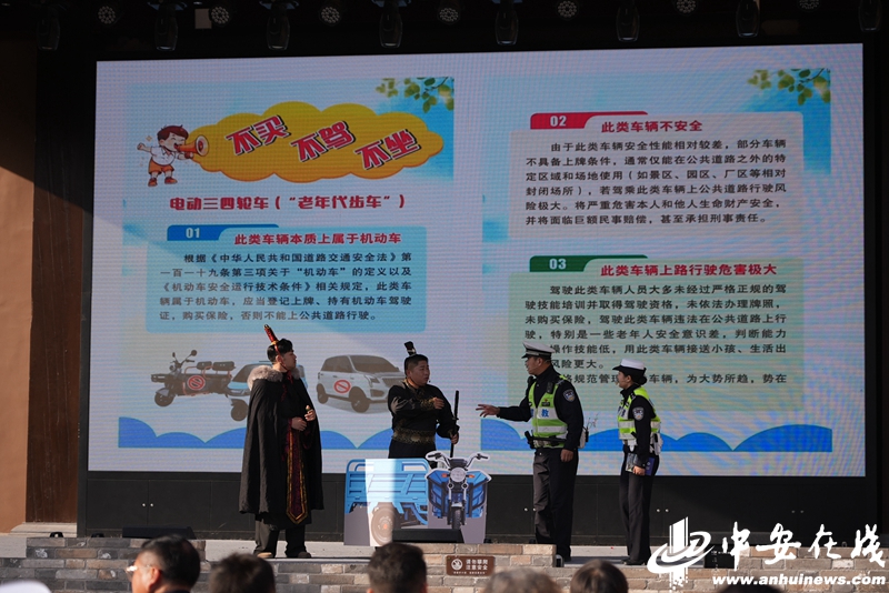 活动现场,情景剧《楚王出游新篇》创意结合近期备受关注的武王墩考古热点,让“穿越”而来的楚王与将军在现代社会因三轮车违法载人,接受交警安全教育,生动揭示了此类行为的危害。儿童情景剧《西游平安行》则以经典故事为外壳,注入现代交通规则内核,由小演员们趣味演绎,收获阵阵掌声。