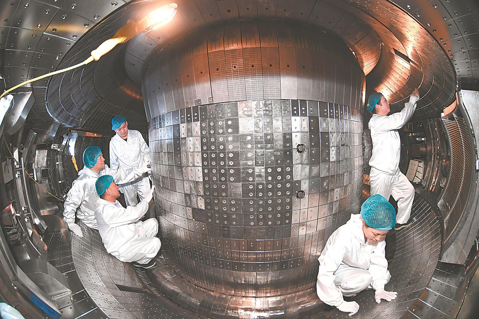 中国科学院合肥物质科学研究院科研人员 在全超导托卡马克核聚变实验装置(EAST)内进行升级改造。记者 张大岗 摄
