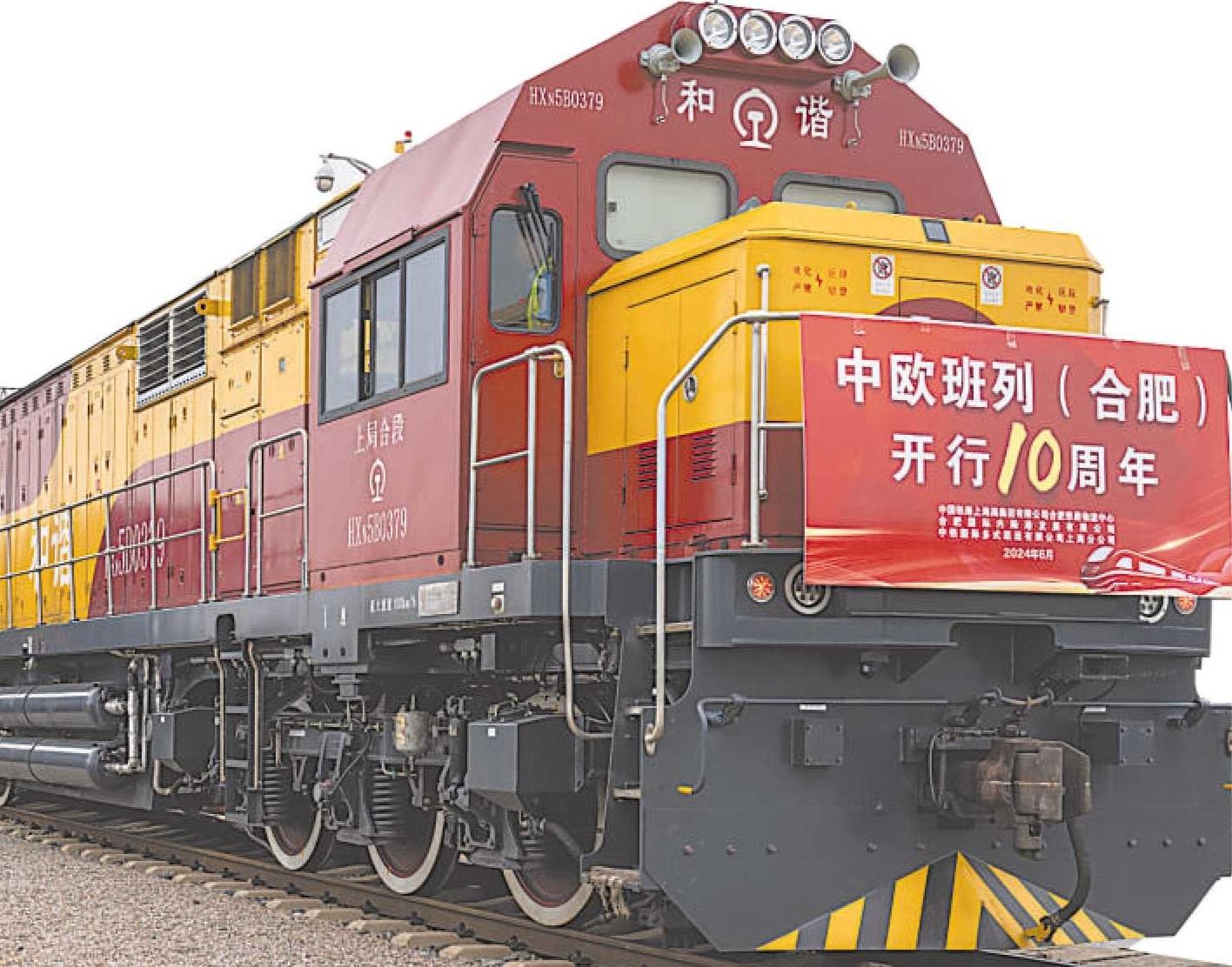 在合肥北物流基地,满载皖产光伏、电器等货物的X8410号中欧班列。中欧班列将合肥乃至安徽与世界紧紧连在一起,不断跑出互利共赢“加速度”。 通讯员 赵明 摄