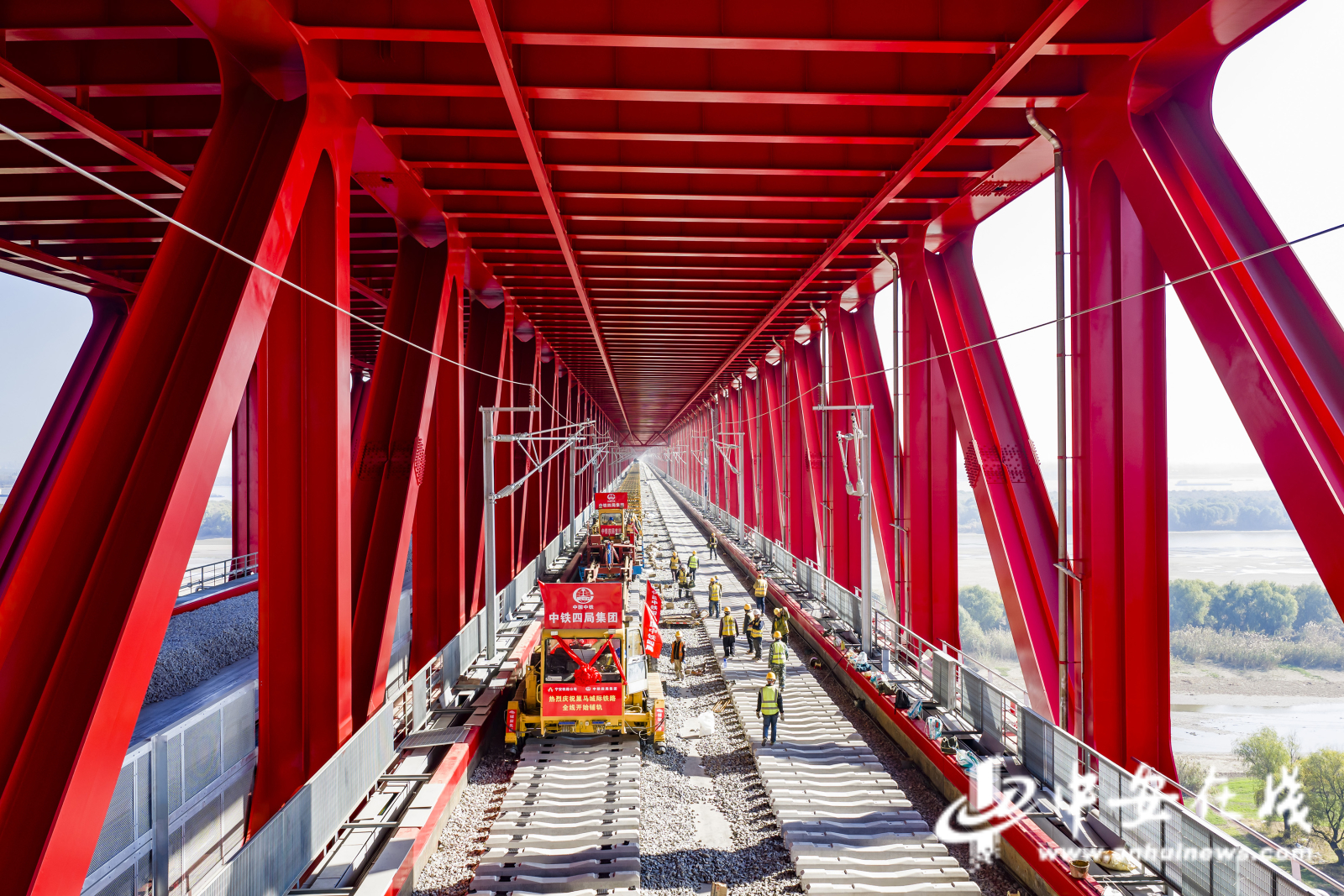 此次铺轨采用的国产WZ500型长轨铺轨机,由我国自主研发。该铺轨机组电气控制系统采用可编程逻辑控制器进行集中控制,可实现各动作的精确协调,控制误差小于5毫米;抓取装置采用先进液压夹轨器,夹轨力高达200kN,可牢固地夹紧轨排,有效防止吊运过程中轨排滑落。该机组单日最快铺轨进度可达6公里,预计全线铺轨任务将于明年1月完成。