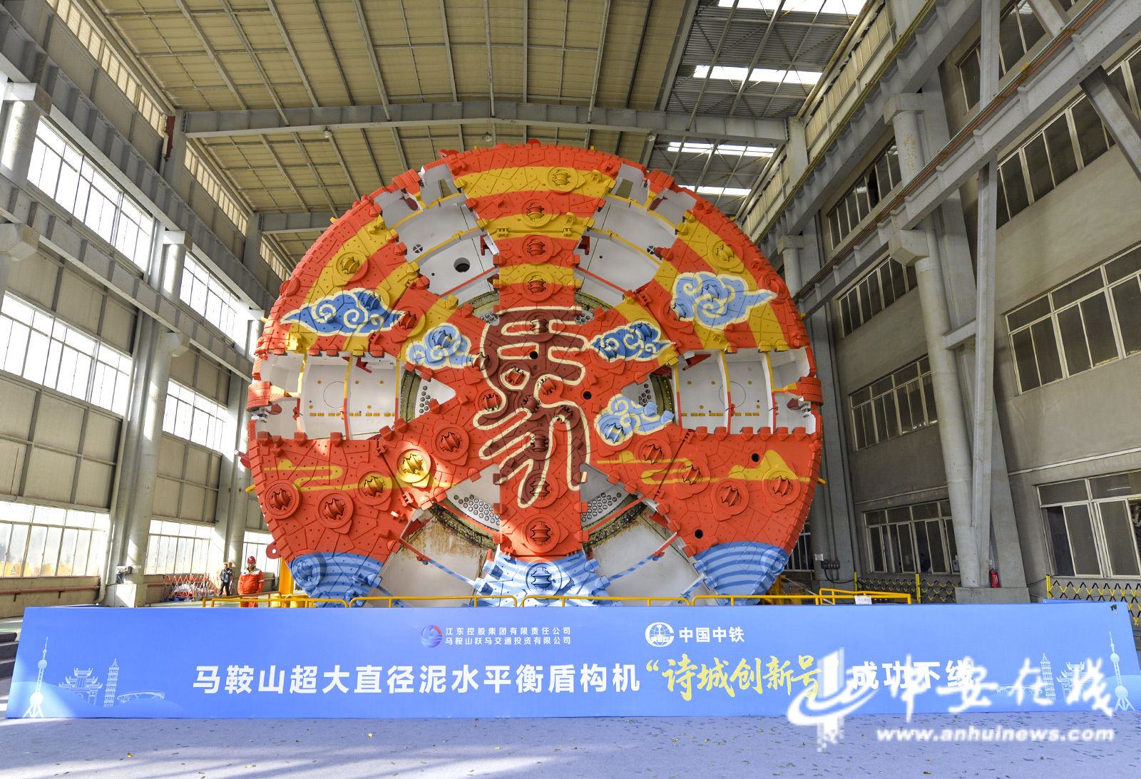 中安在线、中安新闻客户端讯 12月3日,马鞍山市首条过江隧道——湖北路过江通道项目迎来重大节点,为项目量身定制的“诗城创新号”超大直径泥水平衡盾构机在上海正式下线,即将开启“皖江第一长隧”建设新征程。