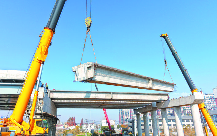 6日上午,施工人员正在架设上跨巢柘路预制箱梁。