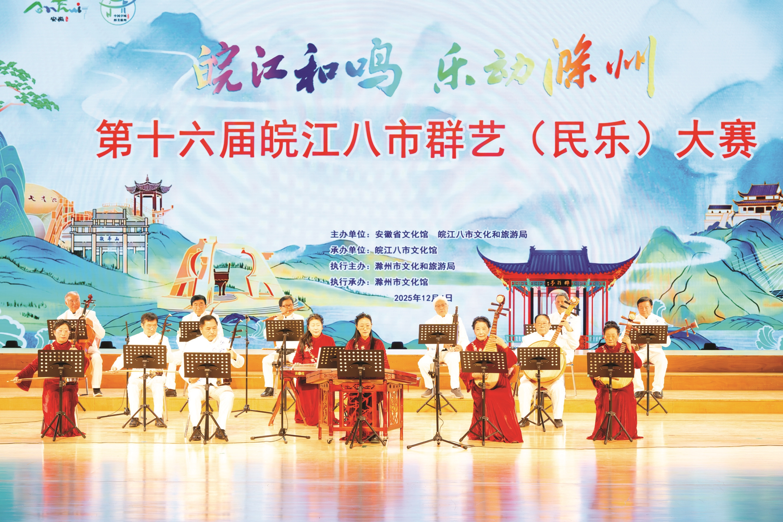 皖江八市群艺大赛创办于2007年,由滁州、马鞍山、芜湖、宣城、铜陵、池州、安庆、黄山8个城市共同发起,每年举办一次。12月4日晚,本届比赛拉开序幕,各地精心编排选送的17个优秀的民乐节目轮番上台竞演,为观众献上了一场精彩纷呈的民乐艺术盛宴。5日下午举办的精品节目展演暨颁奖典礼上,不仅获奖节目依次亮相,还特邀今年第七届“出彩滁州人演出季”获奖选手登台献艺。本届大赛在国家公共文化云等平台全程网络直播,在线观看超40万人次。