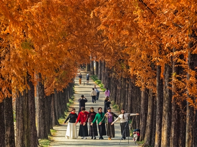 12月3日,在徽州区林业研究所的小路上,两排水杉林如同烈焰般绚烂,每一根羽状叶片在阳光下呈现绯红色,构成一幅冬日美丽的画卷,吸引众多市民游客前来打卡拍照,留下最美的瞬间。 施亚磊/摄