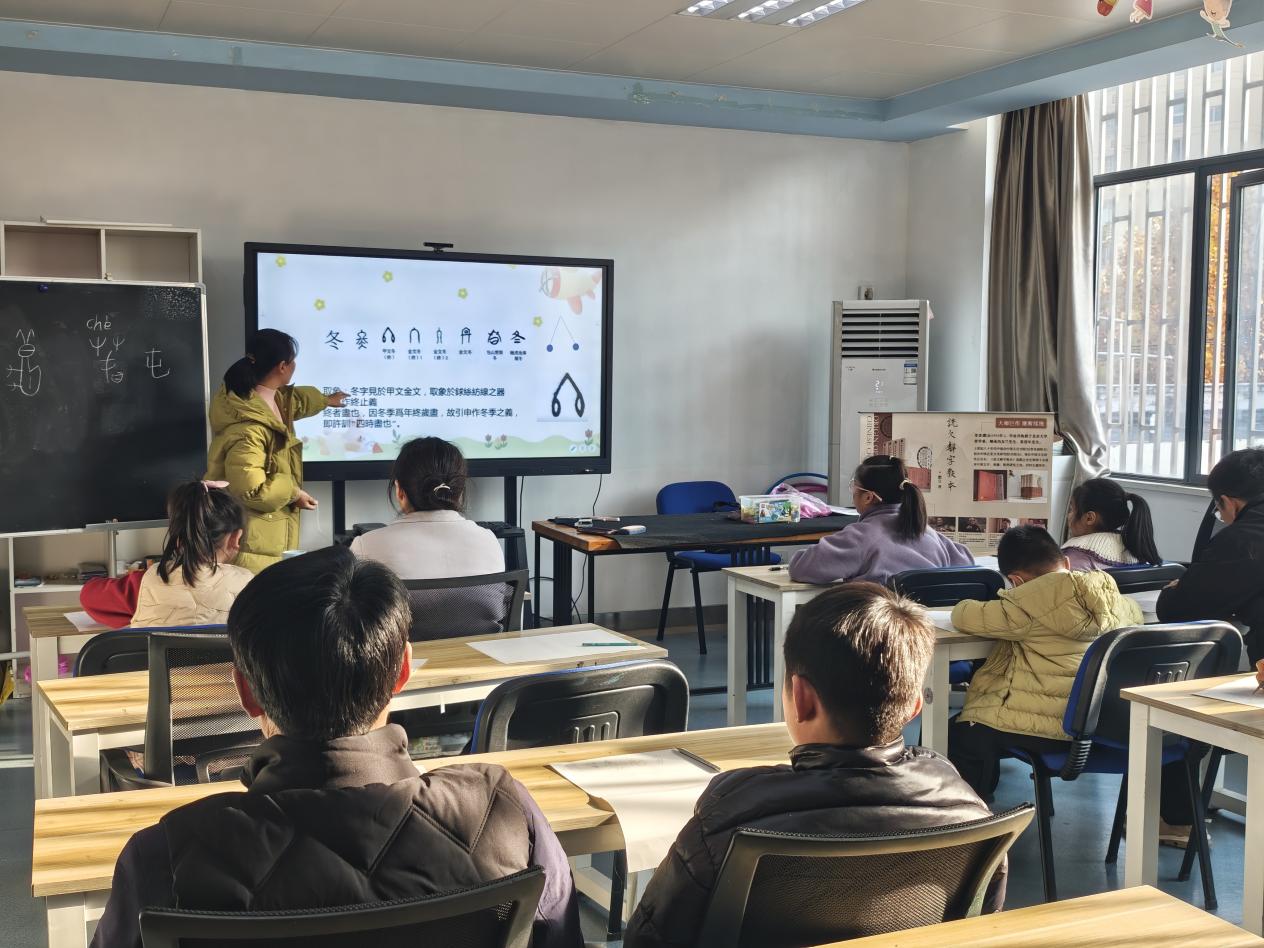 活动伊始,社区志愿者李老师以一幅意境悠远的“雪景图”和甲骨文中的“雪”字字形为引,瞬间抓住了孩子们的目光。她从“雪”字的演变讲起,解析其如何像形又表意,继而拓展到“冬”“寒”“冰”等相关时令汉字的构造与内涵。“原来‘寒’字下面的两点,古时候是表示冰啊!”一位小朋友在互动环节兴奋地分享自己的发现。通过生动讲解、趣味问答和字卡拼图游戏,枯燥的文字学知识变得鲜活起来,孩子们在亲手触摸汉字骨骼、拼组字形演变的过程中,不仅记住了字形字义,更直观感受到了先民观察自然、凝结智慧创造文字的伟大。“说文解字”不止于“字”,活动巧妙地将汉字学习与大雪节气的物候特征、传统习俗、养生文化相结合。在“咏雪诗韵”环节,亲子家庭共读古典诗词,从“窗含西岭千秋雪”的壮阔到“大雪压青松”的坚韧,体会语言文字所承载的审美意境与精神品格。在“节气智慧”分享中,大家讨论了“瑞雪兆丰年”的科学道理,了解了腌肉、赏雪、进补等民俗背后的生活哲学。“以前觉得节气就是日历上的一个名词,今天和孩子一起,从一个‘雪’字挖出了一整片文化宝藏,连我们都学到了很多。”参与活动的家长司先生感慨道。孩子们则纷纷表示,没想到汉字这么有趣,每个字都像一幅画、一个故事。