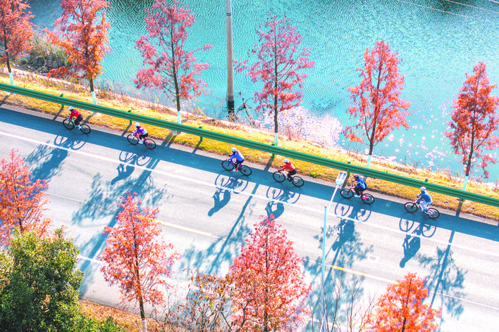12月7日,在安徽省芜湖市繁昌区繁阳镇范马村,自行车运动爱好者在风景如画的淮九公路上骑行(无人机照片)。新华社发 肖本祥 摄