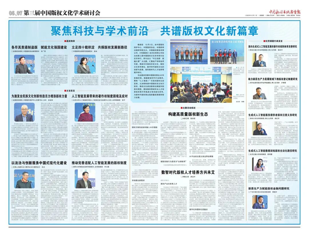 12月5日,由中国版权保护中心、中国版权协会、中国新闻出版研究院主办,中国版权服务有限公司、《中国版权》杂志社有限公司协办的第三届中国版权文化学术研讨会在京举行。研讨会以“守正创新版蕴文景”为主题,汇聚政产学研各界专家,围绕中外版权历史文化、版权文化学术理论、数字时代版权文化的创新与发展、版权教育与人才培养等展开研讨。