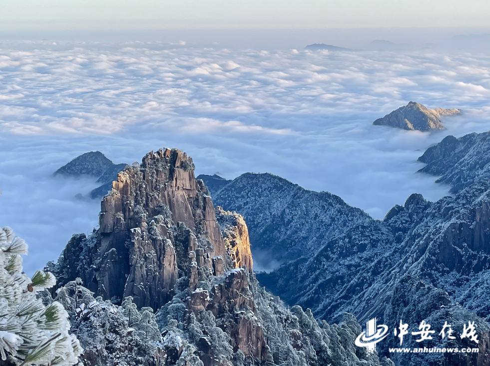 黄山风景区雪后放晴,云海、晚霞、雪景齐现,为游人献上独属于冬日的视觉盛宴。