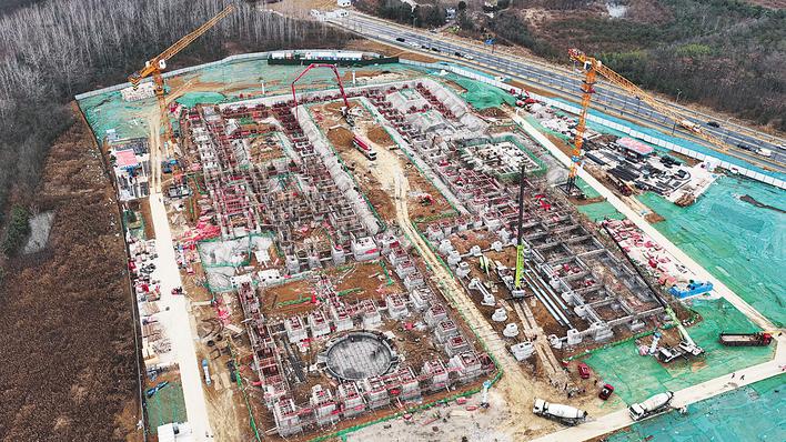 在庐阳区大气路与雷水路交口西北角,深空科学城一期I标段建设正全力推进。放眼望去,工人身影忙碌,机械运转不息,一派热火朝天的施工景象。合肥未来大科学城建设投资有限公司项目负责人徐振睿介绍,本项目钢结构主次结构重量约为4000吨,其中钢结构钢柱总数127根,檐口最大高度达33米,屋面桁架最大跨度为44米,构件重、跨度大,起吊高度高成为本项目钢结构施工的重难点。整体项目预计在2027年1月前完工。