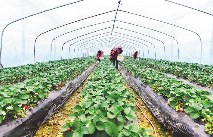 12月22日,庐江县汤池镇凤桥社区的草莓种植户正在温室大棚采摘草莓。近年来,汤池镇持续推动草莓种植技术创新,让草莓上市时间较以往提前约两个月,成为当地特色农业的一张亮丽名片。