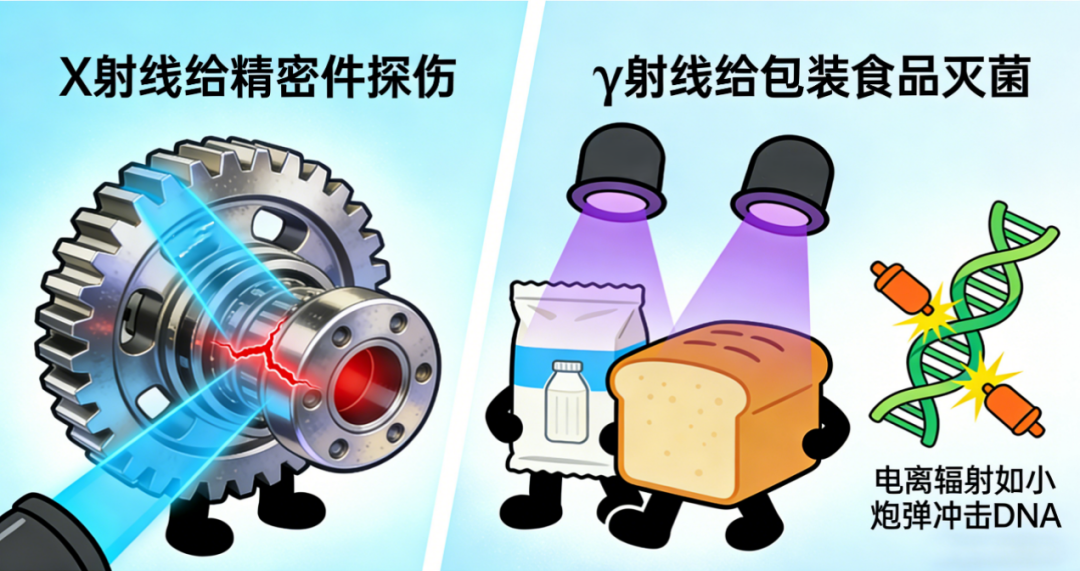 射线就像工厂的“火眼金睛”:X射线可以给精密件“探伤”,能查出肉眼看不到的内部裂缝;γ射线能够穿透包装食品,杀死里面的有害细菌;还有诸如给塑料薄膜测厚度、快速火灾报警、适时货物称重、连续行李安检等等,都有它忙碌的身影。