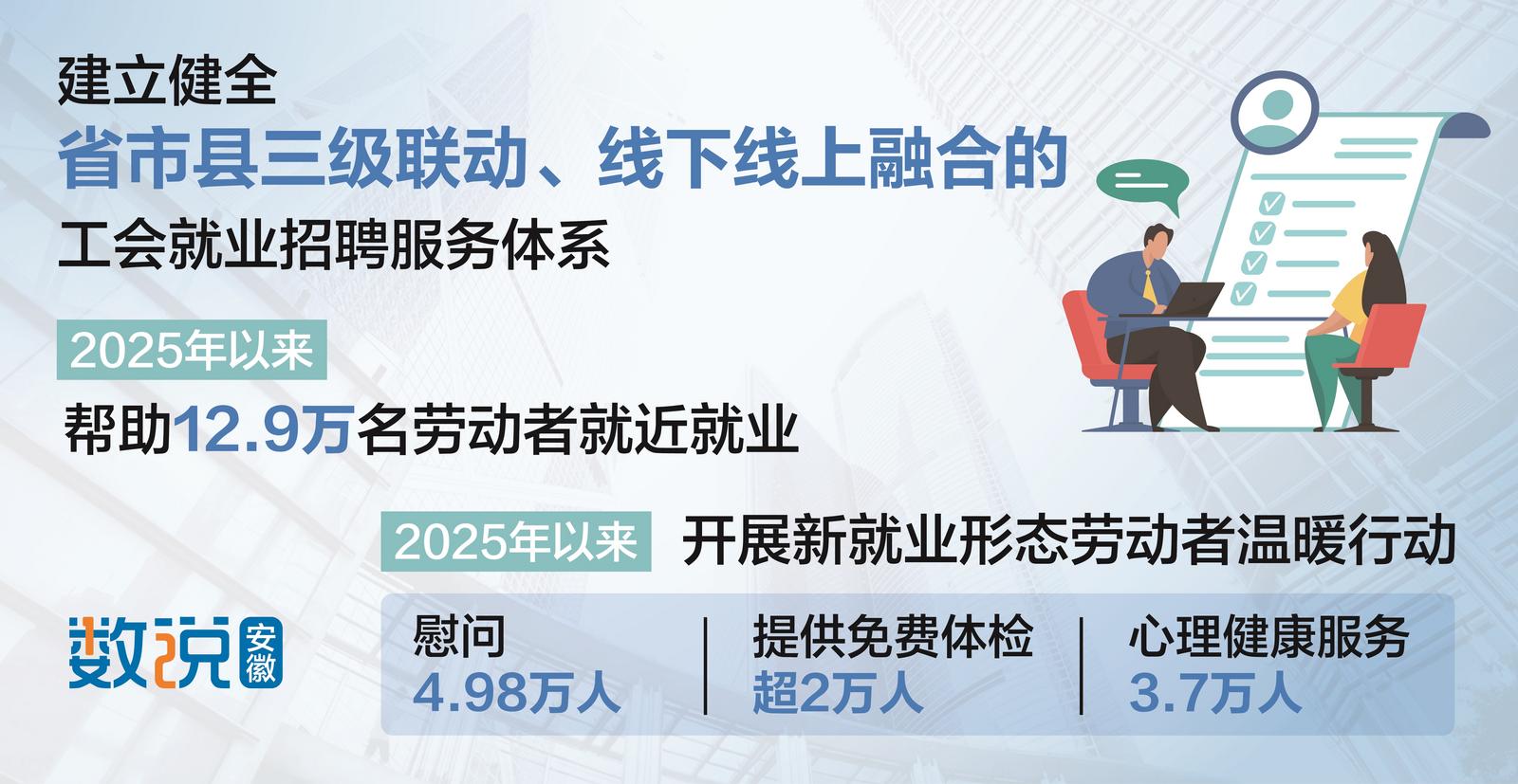 春风送暖,就业先行。针对部分职工就业困难、企业用工短缺的“两难”问题,省总工会深入开展“工会送岗位 乐业在江淮”就业援助行动,建立健全省市县三级联动、线下线上融合的工会就业招聘服务体系,搭建“用工方”与“求职者”的精准对接平台,今年以来帮助12.9万名劳动者就近就业。