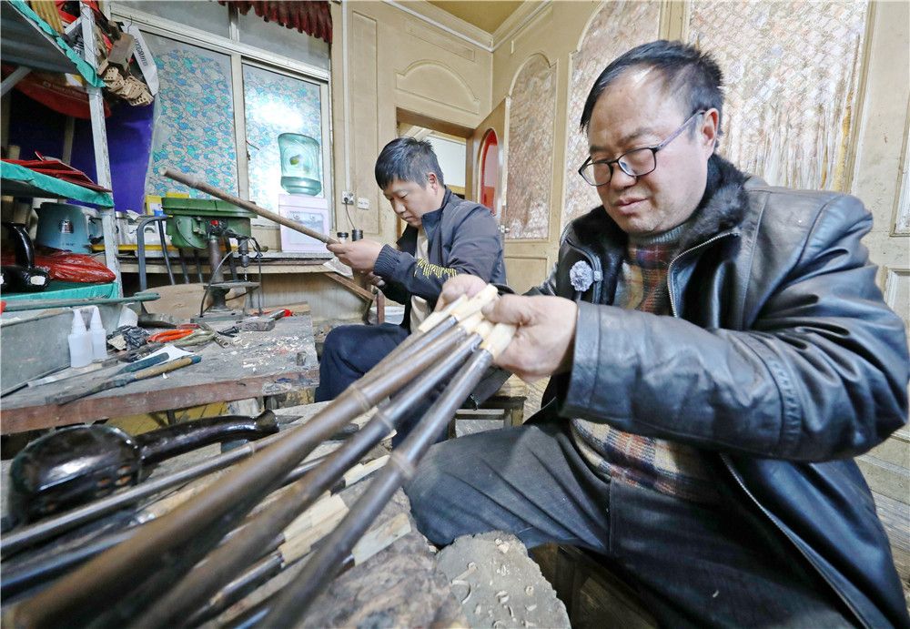 卢俊军(右)和儿子卢西强(左)在一起制作笙。