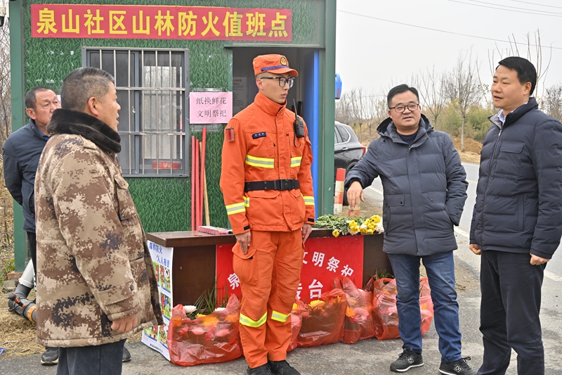 期间,支队长付增勇、肥东县县委副书记陈涛、肥东县副县长孔天华先后到执勤一线,督导检查此次防火专项行动工作落实情况,看望慰问一线指战员。大队采取“流动+定点”的宣传方式深入社区、村镇等人员密集区域讲解森林火灾安全常识,在社区3个重要出入口为关键位置,向过往居民和车辆驾乘人员强调祭祀用火“三不准”原则,倡导以鲜花祭祀、丝带寄哀思等文明方式缅怀先人;围绕周边林区开展携装巡护,巡查火灾隐患,严格把控火源上山,坚决杜绝燃放烟花爆竹、野外吸烟等违规用火行为,切实提升群众的防火安全意识和自我约束能力。