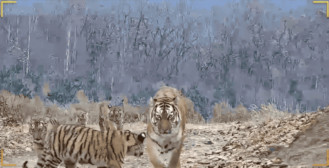 杜佳兴立即打开手机中的实时监测软件,发现一只体型修长、花纹斑斓的母虎正带着它的几只幼崽依次走过。杜佳兴仔细查看发现,镜头中的幼崽有四只之多,目测月龄在四个月左右。