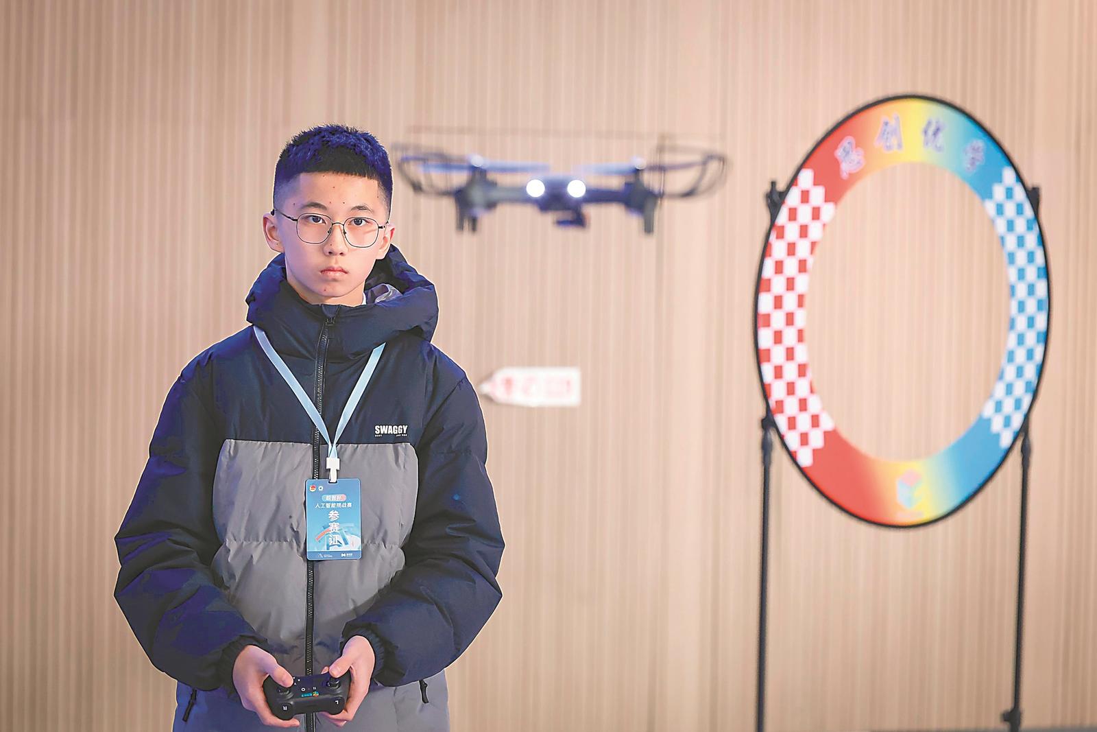 12月27日,第二届“皖智杯”安徽省青少年智能创新公开赛——人工智能创新挑战赛在合肥市第六中学菱湖校区开赛。来自全省16个市的近5000名青少年选手参赛。图为无人飞行器障碍竞技赛。记者 范柏文 摄