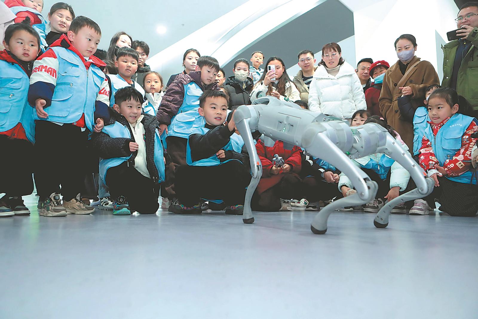 12月27日,蒙城县科技馆,小朋友与机器狗互动。元旦将至,蒙城县科技馆针对亲子家庭和青少年,推出了“科技+年味+文化”的科普嘉年华活动,让青少年沉浸式探索科学奥秘。通讯员 胡卫国 摄