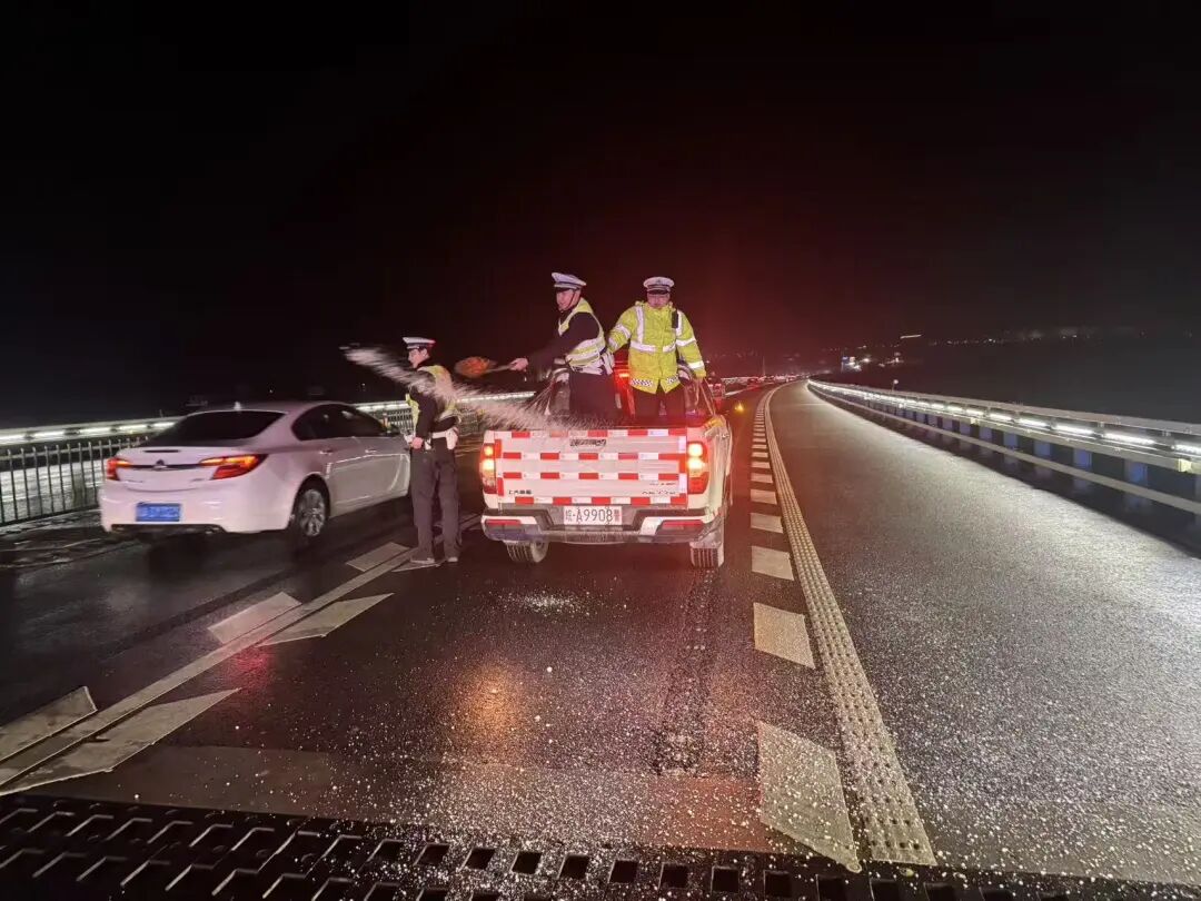 凌晨时分,合肥开始出现雨夹雪,肥西等地的交警冒着严寒开始在高速公路上撒盐除冰,确保高速出行安全。