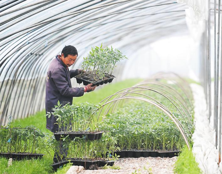 小寒时节,巢湖市农民忙着进行农作物移栽、田间管护等农事活动,田间地头一片忙碌景象。图为中垾镇建华村农民在大棚里起运番茄幼苗。