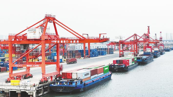 1月6日,航拍下繁忙的合肥港国际集装箱码头,桥吊起落有序,货柜车辆穿梭不息。2025年,安徽港口集团合肥有限公司集装箱累计完成作业量55.1882万标箱,同比增长10.21%;件散货累计完成作业量341.94万吨,同比增长13.85%;滚装船作业量累计14980辆,为区域外向型经济发展注入强劲动能。记者 郭如琦 摄