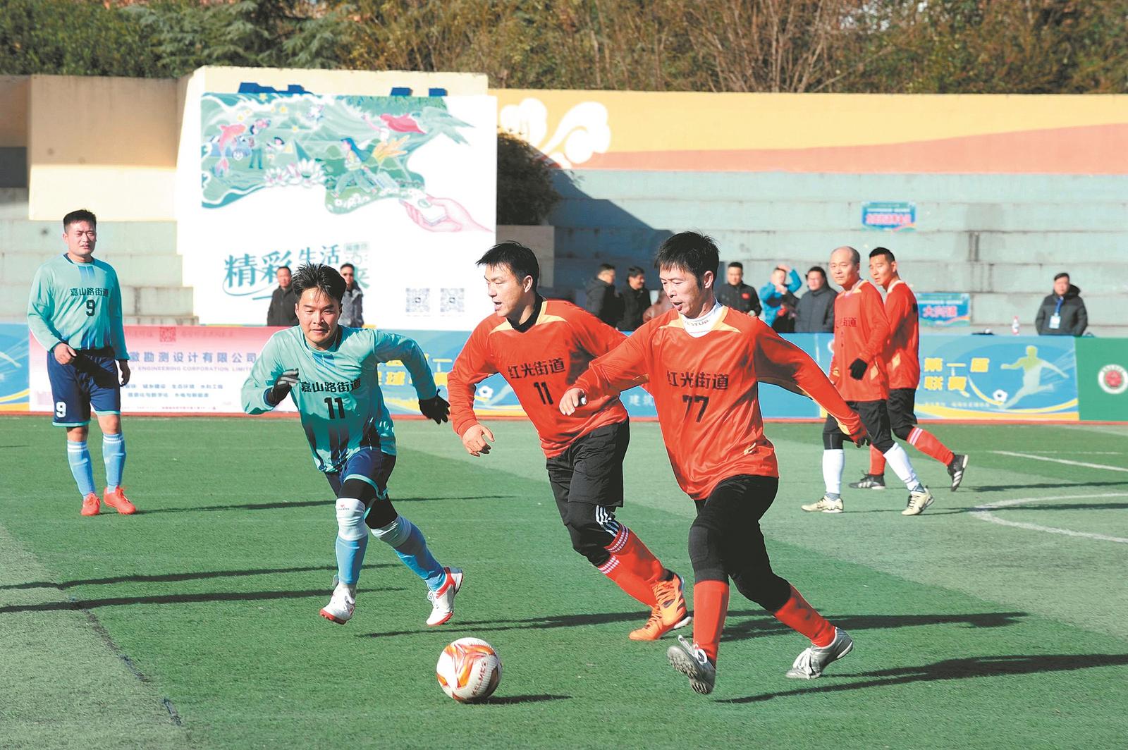 1月11日,合肥市第三十八中学瑶海湾校区(南区)的球场上,双方球员在激烈拼抢。日前,合肥市瑶海区第一届足球联赛开赛,13支代表队的208名职工运动员竞技绿茵场。 通讯员 熊伟 摄