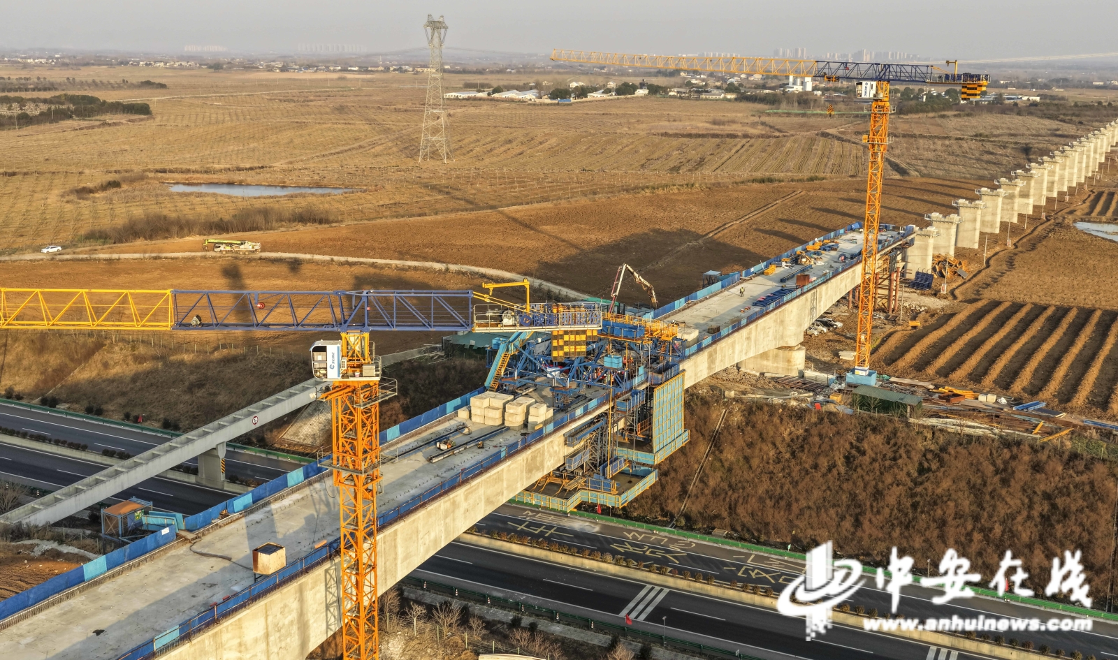 中安在线、中安新闻客户端讯 1月12日,随着最后一方高性能混凝土精准入模,由中铁十局承建的合武高铁HWZQ-1标庐安特大桥(65+112+59)m连续梁实现精准合龙。跨德上高速连续梁合龙段采用挂篮施工,边跨及中跨合龙段长度均为2m,中心梁高5.45m。此次合龙标志着该标段控制性工程取得重大突破,为后续架梁铺轨扫清了关键障碍。