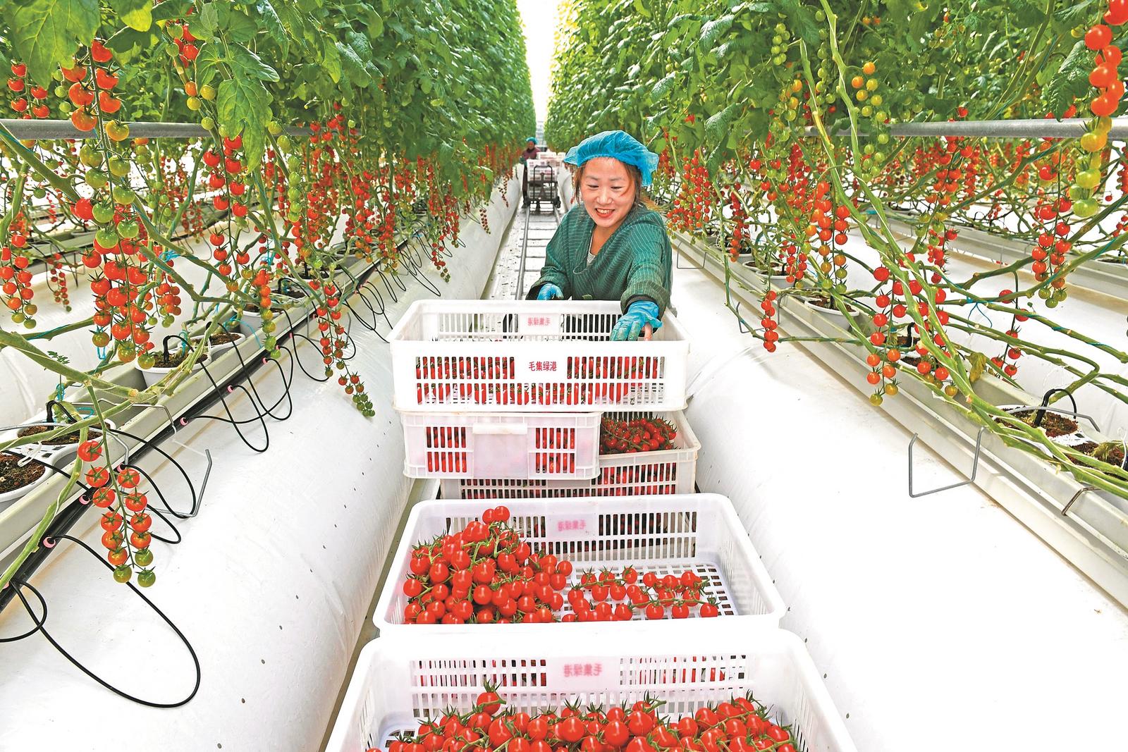 1月15日,淮南市毛集智慧农业科技产业园,工人采摘的番茄,通过电商平台销往全国各地。淮南市全面推进智慧农业建设让传统农业焕发生机与活力。特约摄影 陈彬 摄