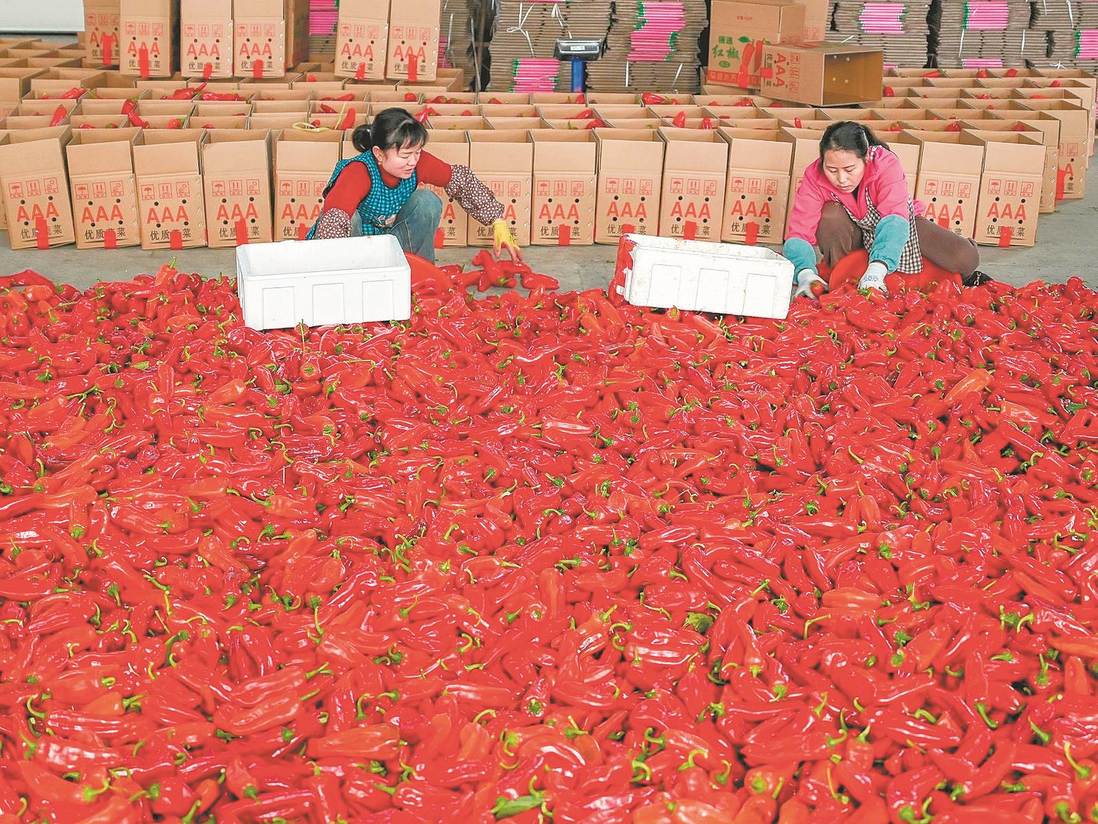 1月16日,在和县历阳镇沈家山村一处蔬菜收购点,菜农们将新鲜的红辣椒分选、装箱。近年来,和县大力发展特色蔬菜产业,有效带动农户增收。通讯员 秦祖泉 摄