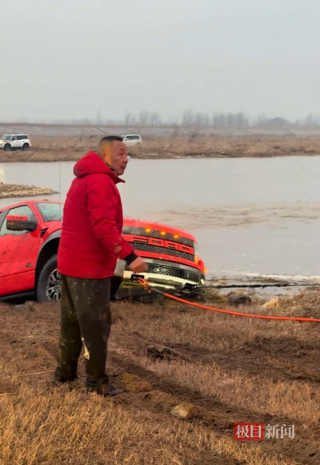 于东来指挥车队帮粉丝将掉入河里的车救出(来源:受访者)