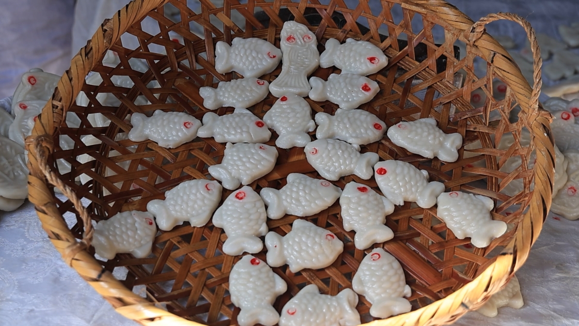在昌溪村,村民吴奇香正和邻居姐妹们忙着制作徽州米粿。浸泡好的籼米磨成粉后,开水一烫、巧手翻揉,抓起米团往雕花模具里一按,再“啪”地磕出来,寓意“年年有余”的鱼形米粿就成型了。蒸熟后的米粿晶莹剔透,口感软糯,是歙县春节期间不可或缺的传统美食。