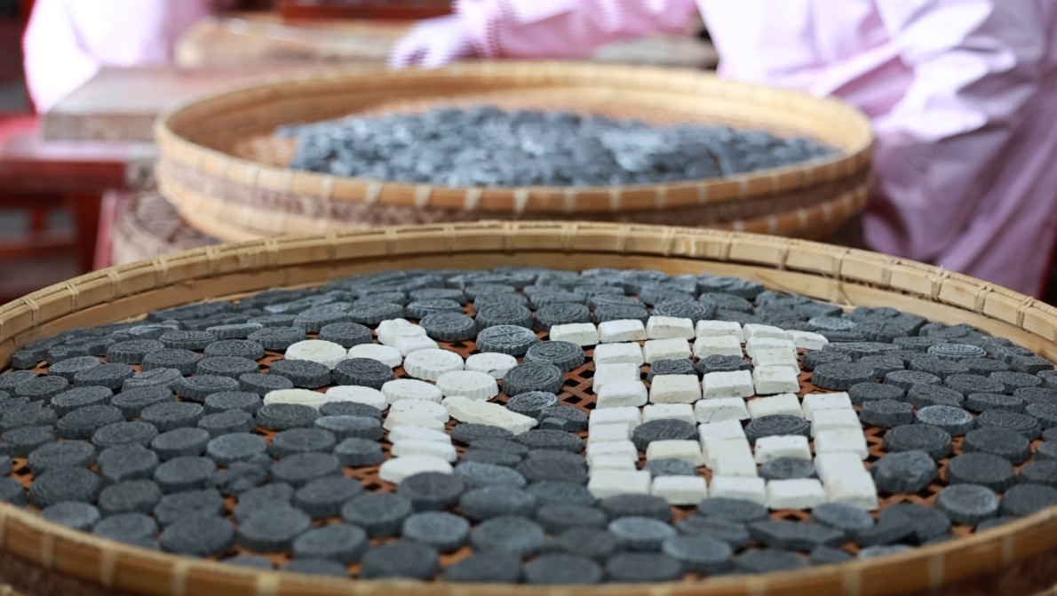 这边米粿的热气还没散,那边福糕的甜香又飘了过来。制作福糕的工序讲究“慢工出细活”:先把籼米、芝麻碾成粉后拌上桂花糖、麦芽糖,反复揉到粉团不软不硬、刚好能捏成型;再塞进刻着古代人物、祈福图文、鱼猴鸳鸯等图案的模具里压实,用劲一拍,带着吉祥纹样的糕坯就出来了,最后用炭火低温慢烤。这些福糕大的像巴掌,小的如指尖,每一块都承载着乡亲们对新年的美好期许。