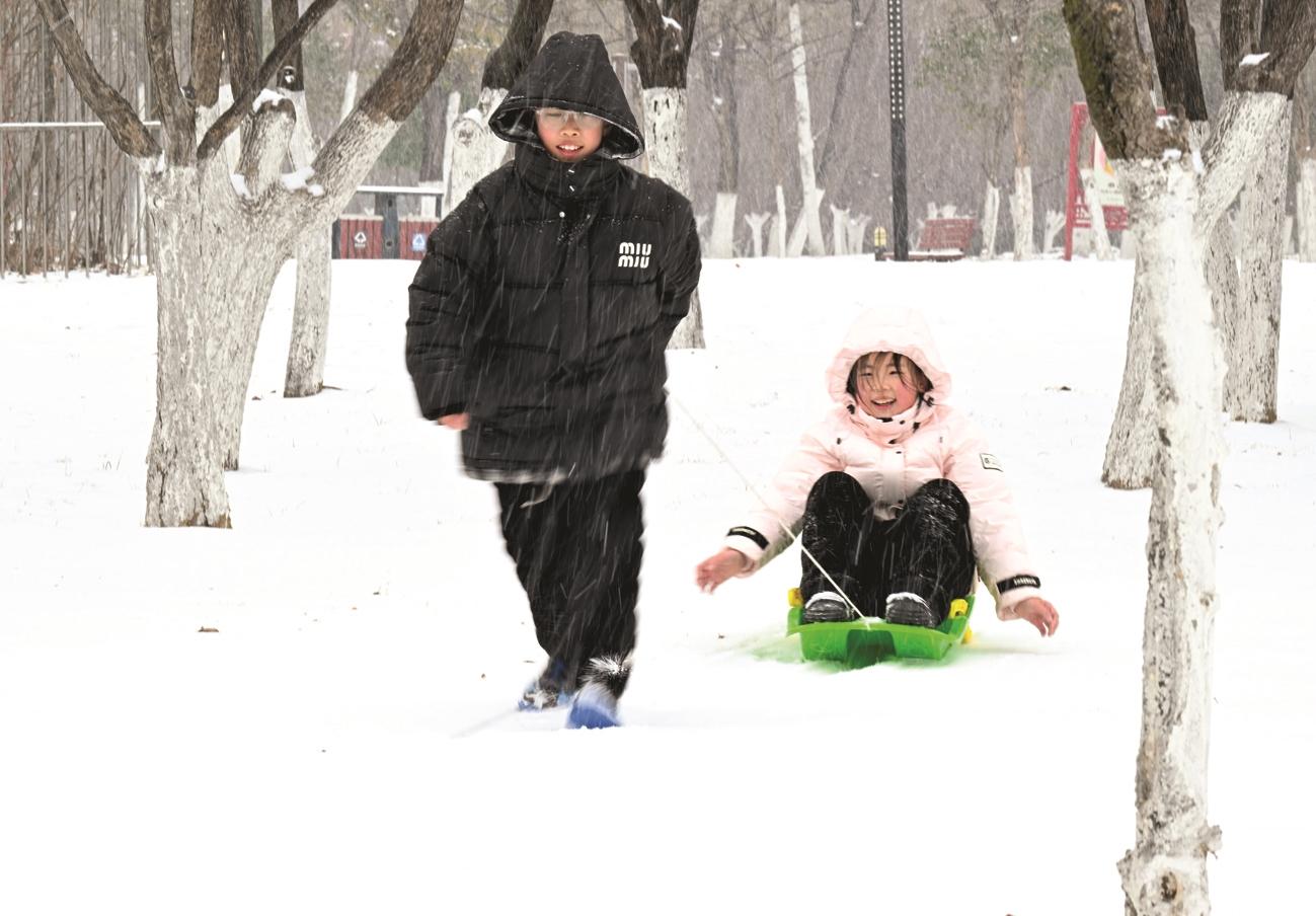 1月19日,在亳州高新区市政公园,孩子们在雪中玩耍。当日,亳州市迎来降雪天气,孩子们在雪中玩耍,堆雪人、打雪仗,尽情享受雪中乐趣。 记者 刘勤利/摄