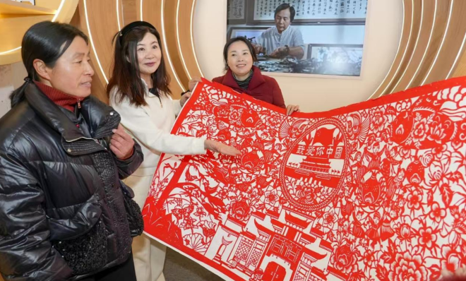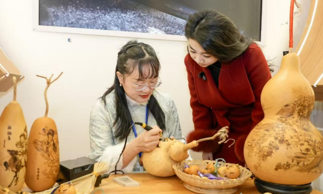 臭鳜鱼、一品锅等美食中的融合滋味,太平猴魁、古井贡酒等茶酒中的一盏情谊,新安剪影、葫芦烙画等非遗技艺中的匠心传承。展厅内,两位非遗传承人巧手生花,现场指导感兴趣的参观者剪纸、烙葫芦画,感受非遗魅力。