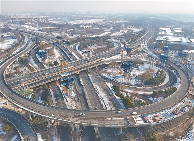 近年来,芜湖市加快构建全国性综合交通枢纽,推进拥江发展,优化江北新区路网布局。目前芜合高速二坝互通施工正酣,项目建成后将实现芜合高速、长江三桥与过江隧道快速互联互通,大幅提升江北新区对外通达能力。图为1月22日记者拍摄的施工现场。记者 杨大伟 摄