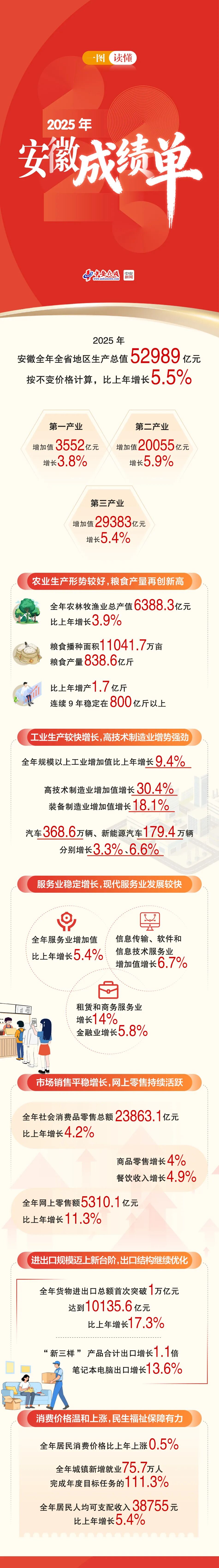 1月23日,安徽省政府召开新闻发布会公布安徽2025经济“成绩单”。2025年,全省经济顶压前行、向新向优向好,生产供给较快增长,新兴动能发展壮大,市场物价持续改善,民生保障不断加强,高质量发展取得新成效。