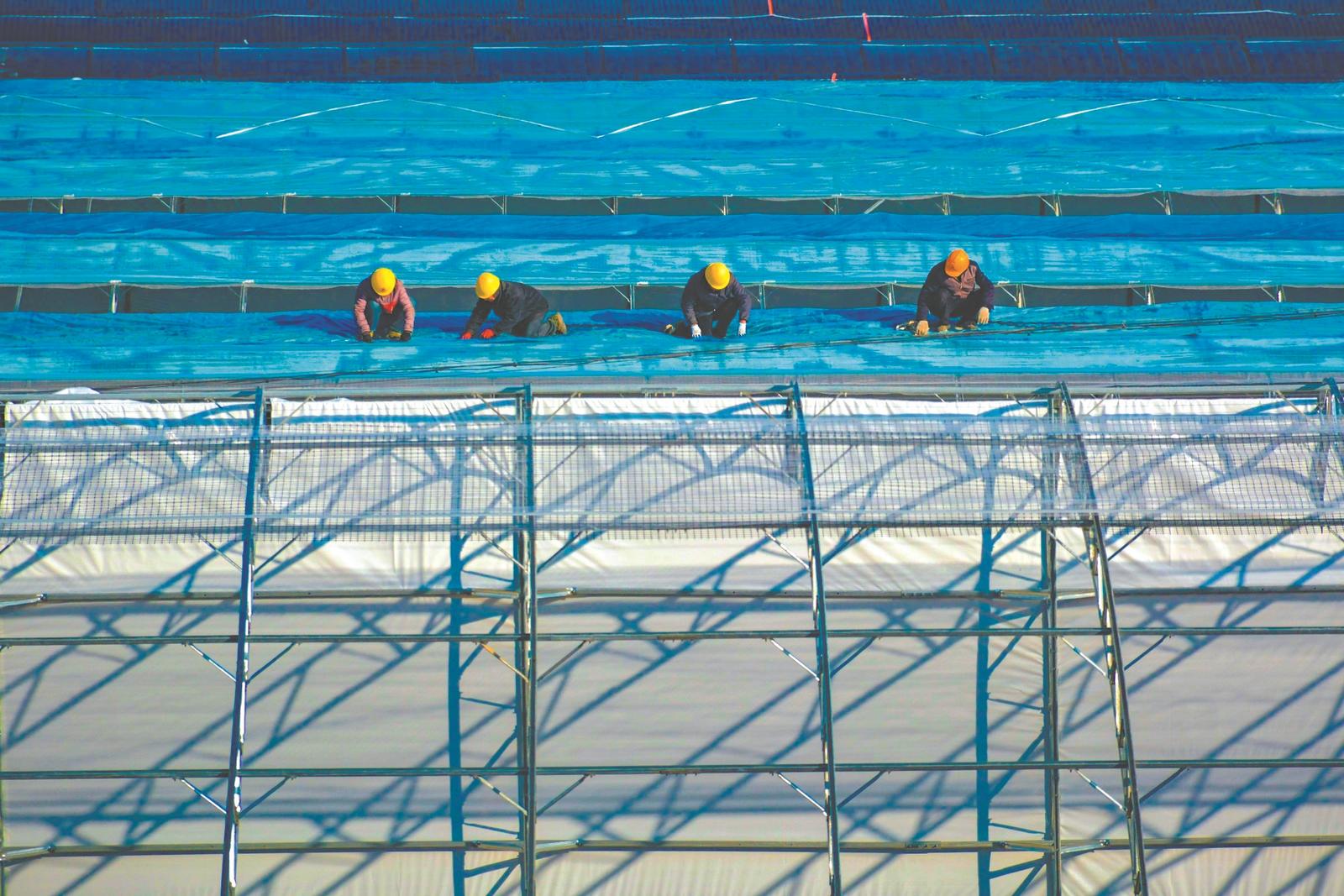 1月23日,在岳西番茄港基地,工人在固定大棚覆膜。