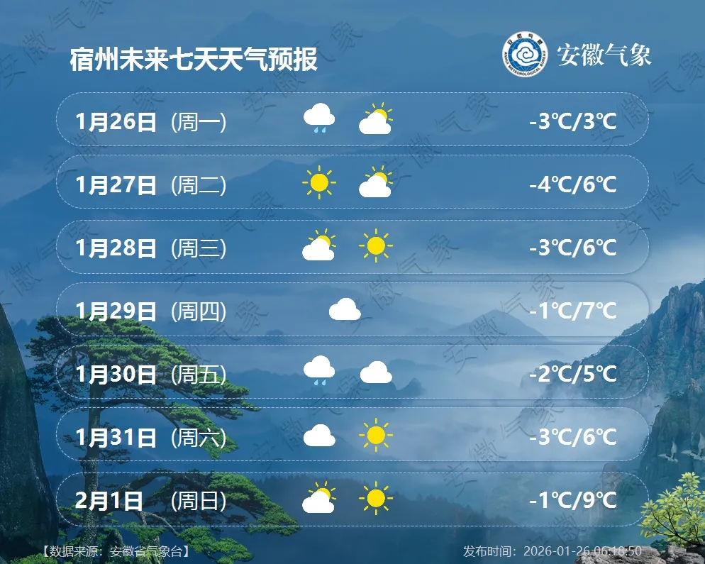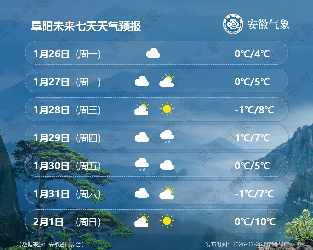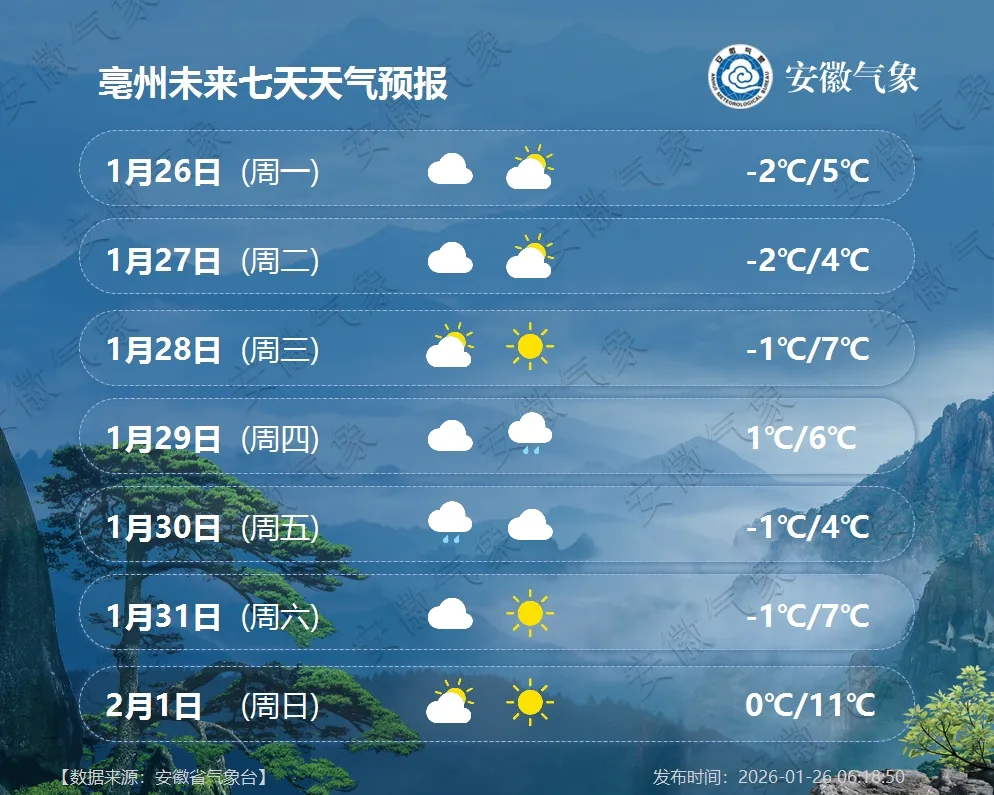 29日:全省多云转阴天。江北大部分地区和江南有小雨。大别山区和淮河以北部分地区有雨夹雪或小雪,其中大别山区部分地区中雪,局部有冻雨。