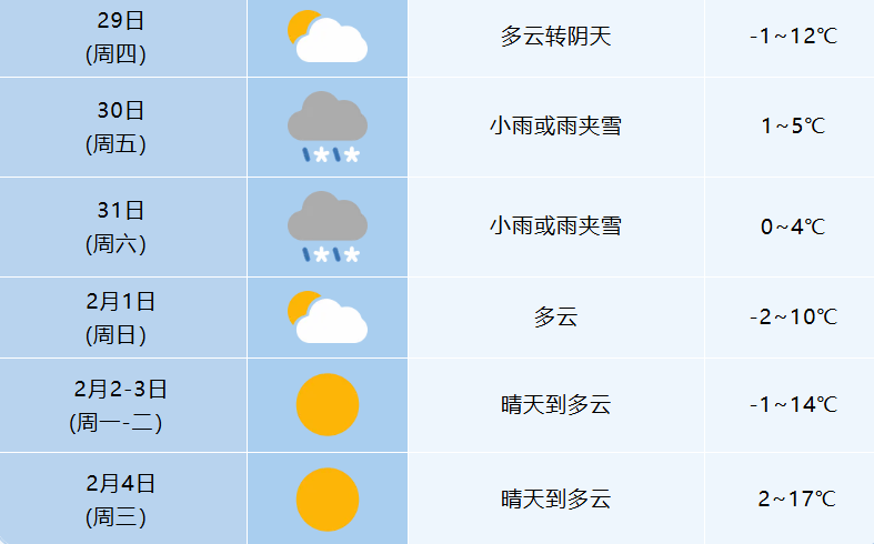 随着新一股弱冷空气即将到来,预计30-31日全市将迎来一次雨雪天气过程并伴有大风和降温,2月1日起转以晴到多云为主。冷空气过后,最低气温降至-2℃左右。