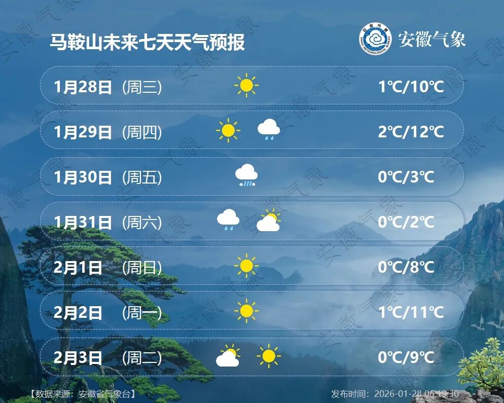 30日(周五):全省阴天。沿江江北大部分地区有小雨或雨夹雪,其中淮河以北部分地区和大别山区有小雪,局部中雪;江南有小到中雨,局部大雨。